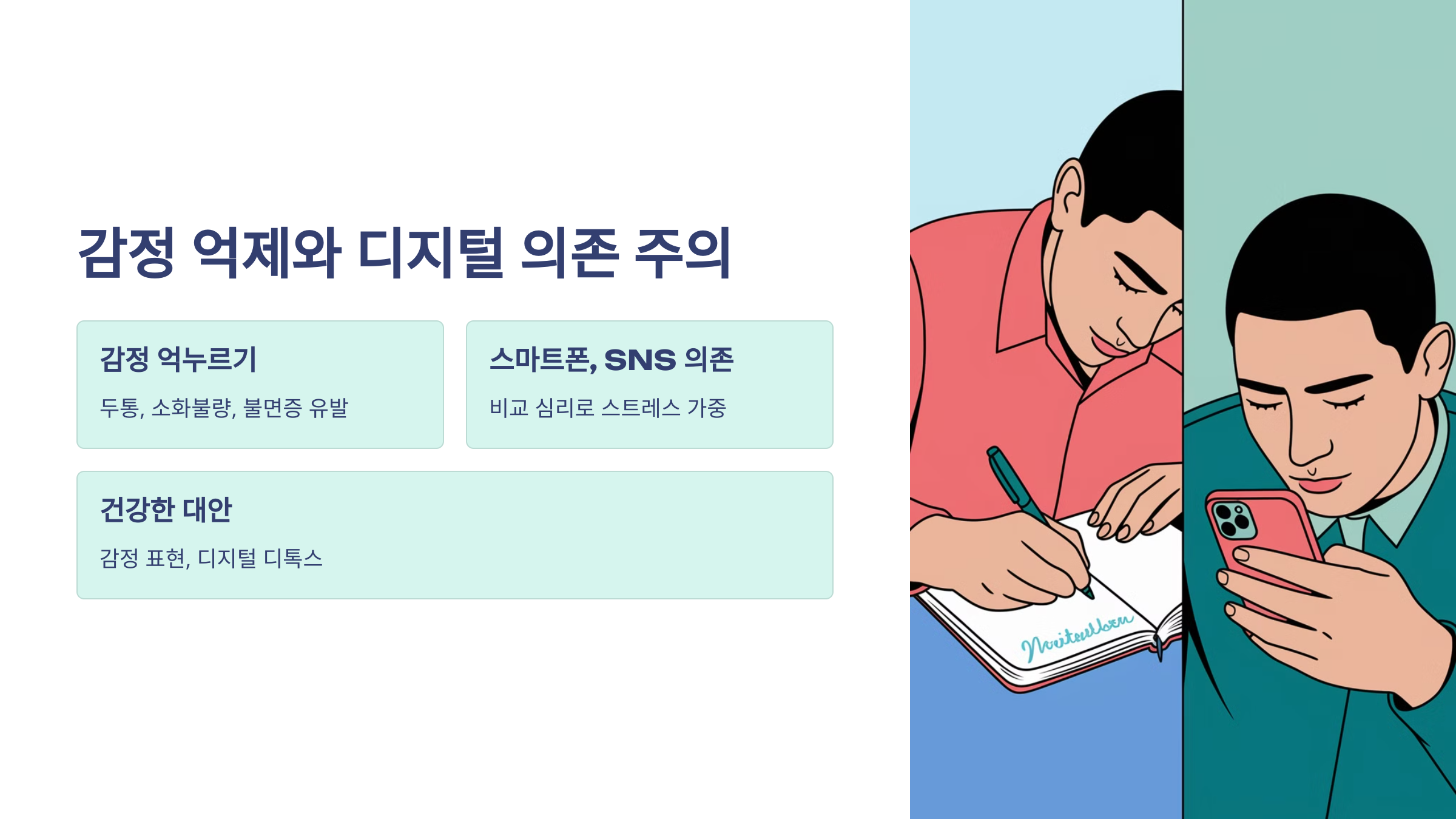 감정을 계속 누르면 신체적으로도 두통, 소화 불량, 불면증 같은 증상이 나타날 수 있어요.