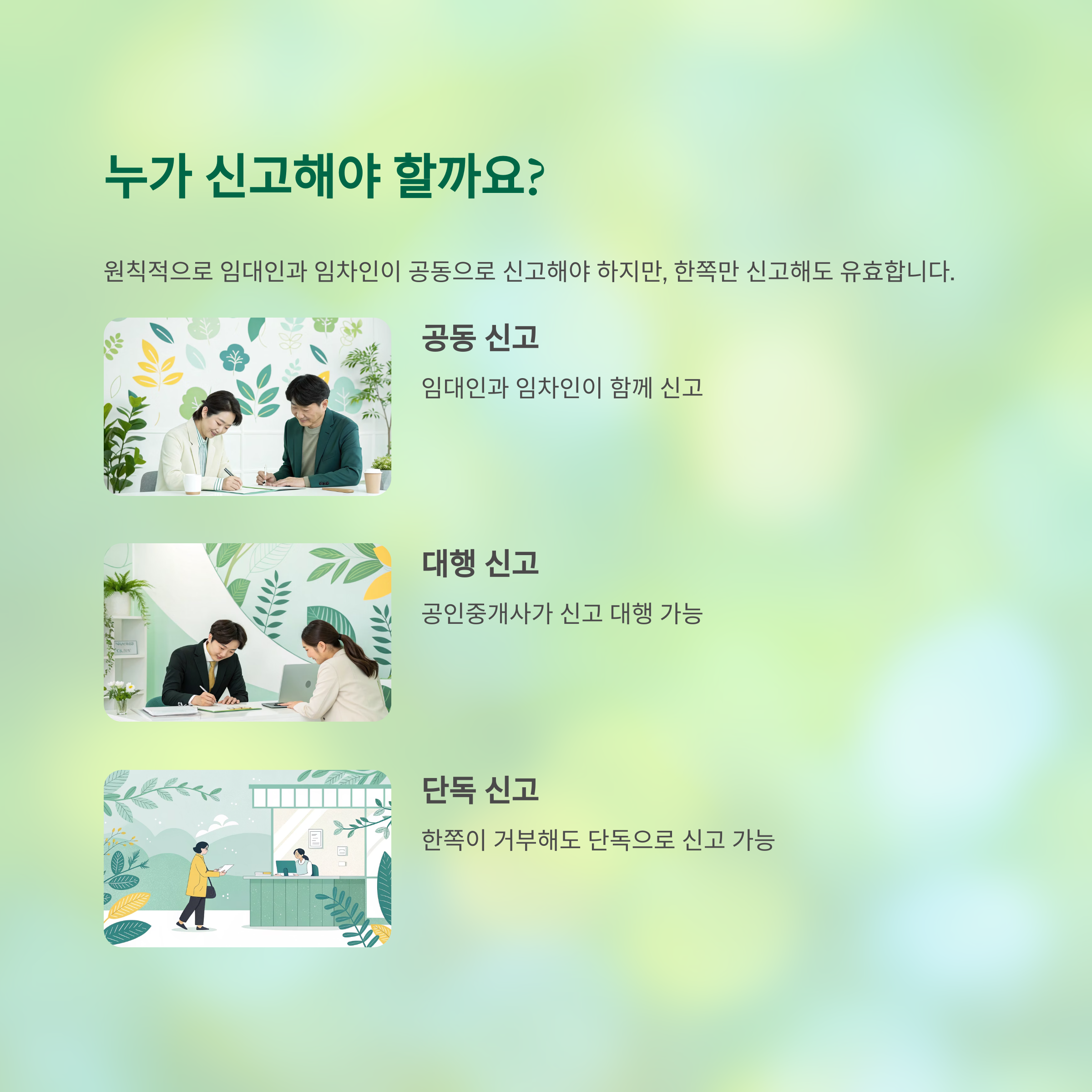 - 신고 의무자: 임대인과 임차인이 공동으로 신고해야 하지만, 둘 중 한 명만 신고해도 돼요.