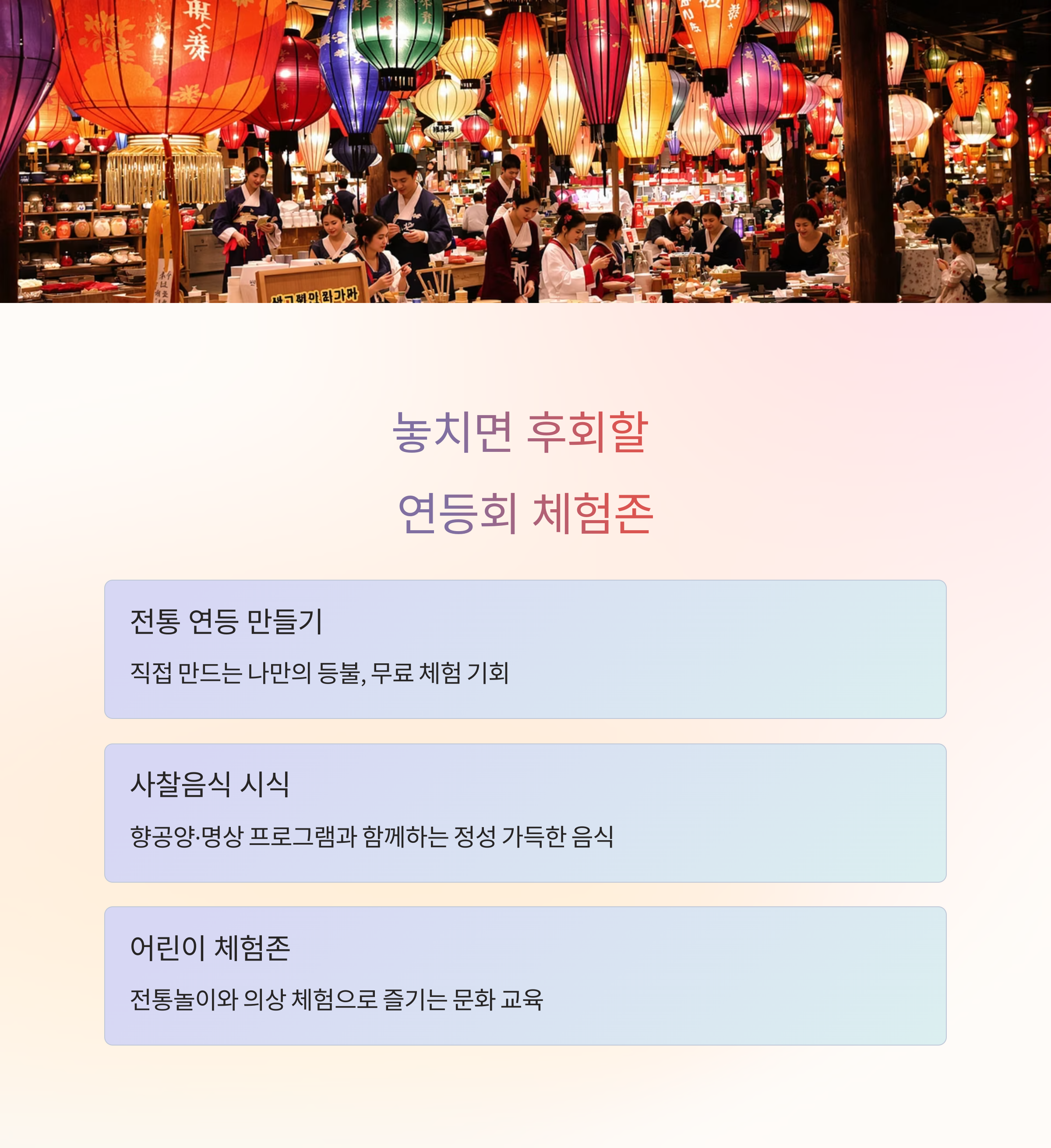 연등 만들기, 사찰음식 시식, 전통예술 공연 등이 펼쳐집니다
