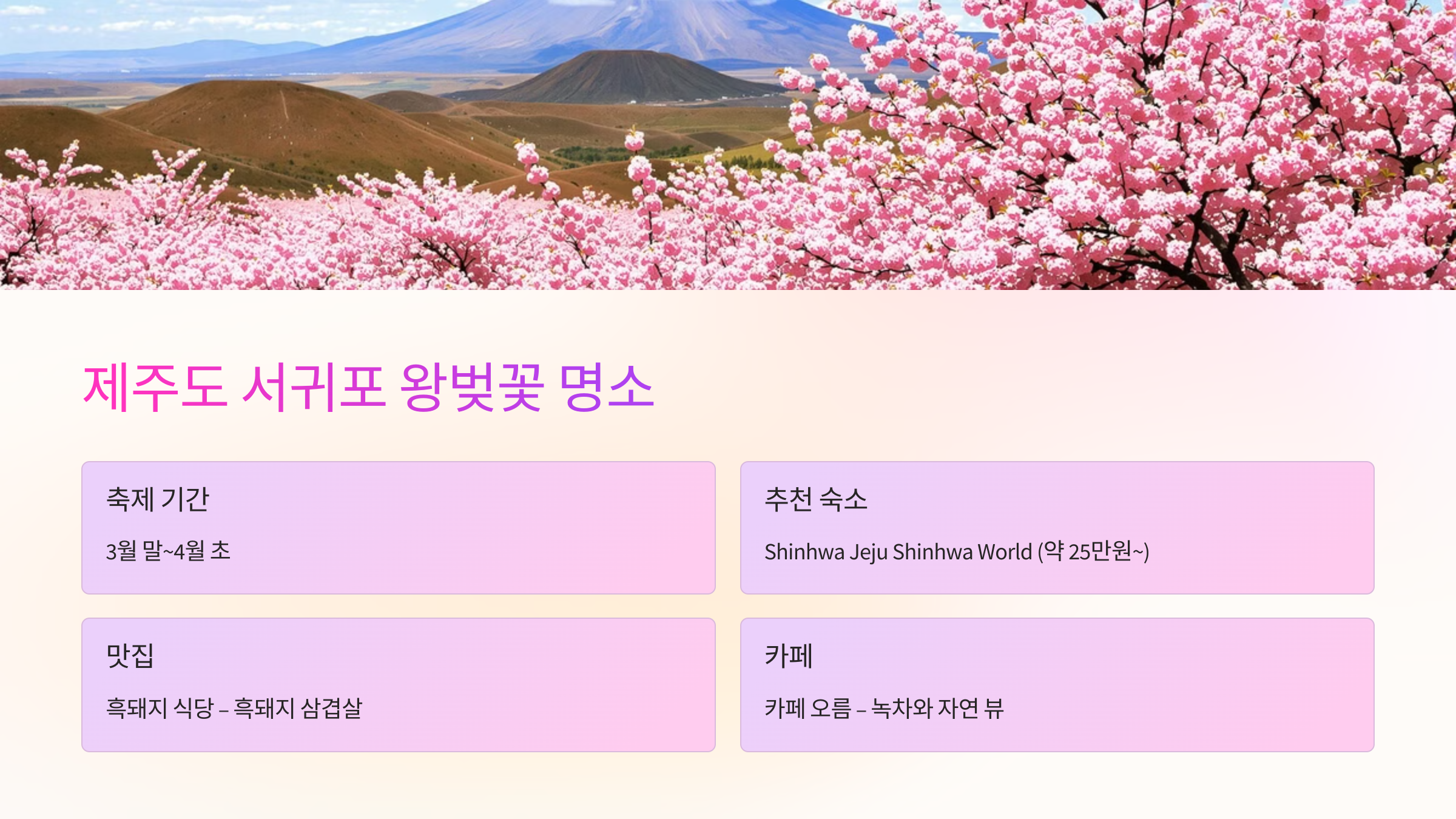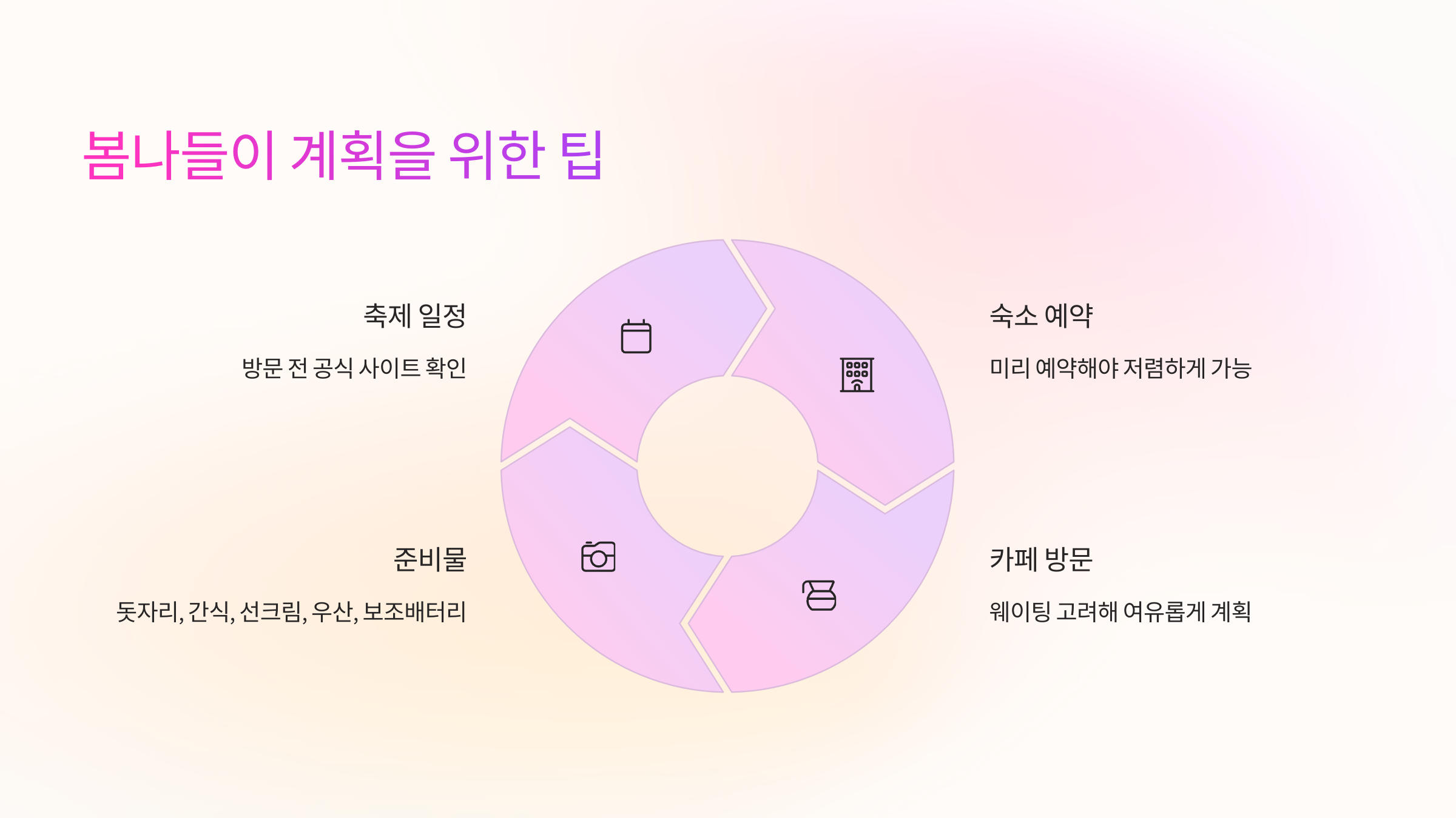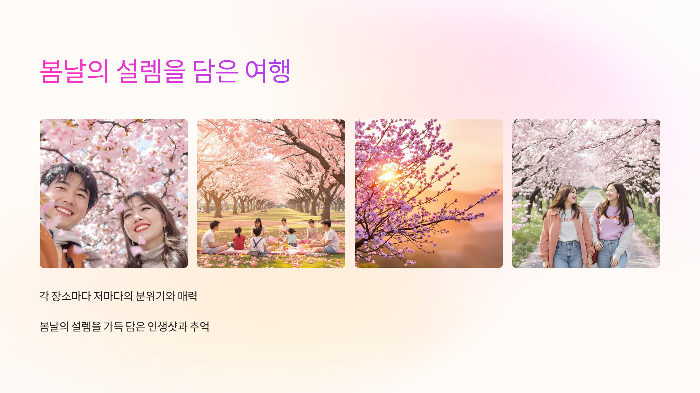 봄날의 설렘을 가득 담은 여행, 여러분의 인생샷과 추억이 풍성해지길 바라며! 혹시 다녀오신 곳이나 추가로 추천하고 싶은 곳 있으시면 댓글로 공유해 주세요. 함께 더 풍성한 여행 이야기를 나눠봐요 :)