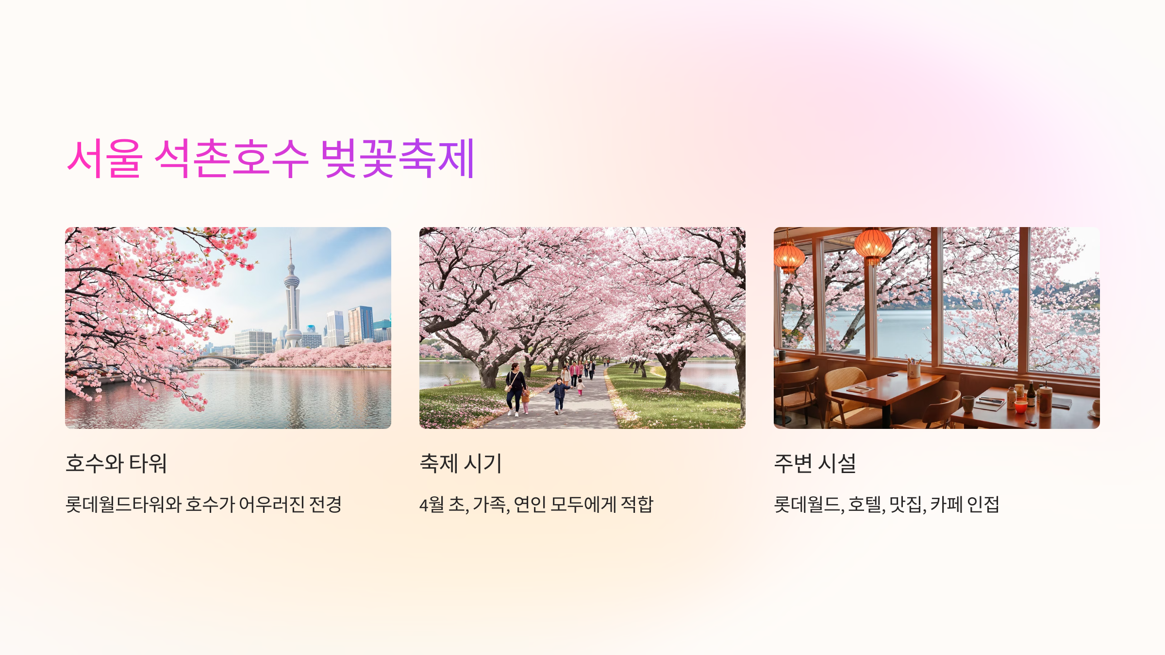도심 속 호수 따라 만발한 벚꽃길, 그게 바로 석촌호수의 매력이죠. 특히 롯데월드타워와 호수가 어우러진 전경은 정말 압도적이에요. 4월 초에 열리는 축제는 가족 단위, 연인, 친구들 누구와 가도 만족할 만한 구성으로 이뤄져 있고요. 게다가 롯데월드도 근처라 하루 종일 알찬 나들이가 가능해요.