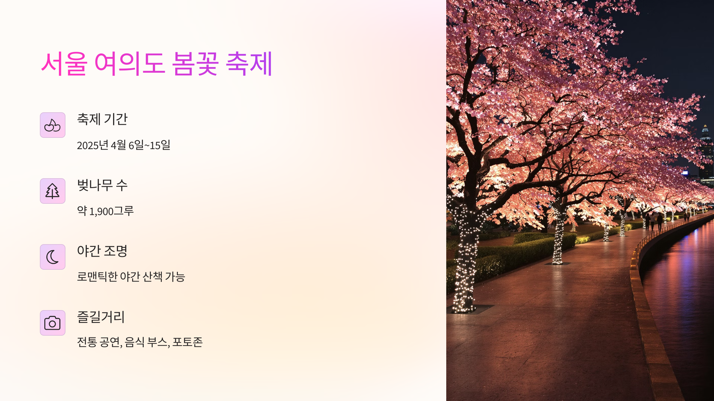서울 한복판에서 만나는 벚꽃, 그중에서도 여의도 봄꽃 축제는 단연 최고죠. 2025년 4월 6일부터 15일까지 열리는 이 축제는 한강과 국회의사당을 배경으로 약 1,900그루의 벚나무가 꽃망울을 터뜨립니다. 저녁에는 야간 조명 아래에서 로맨틱한 산책도 가능해요. 전통 공연과 음식 부스, 각종 포토존까지 있어 데이트는 물론 가족 나들이로도 안성맞춤입니다. 클룩 예약 바로가기 Click