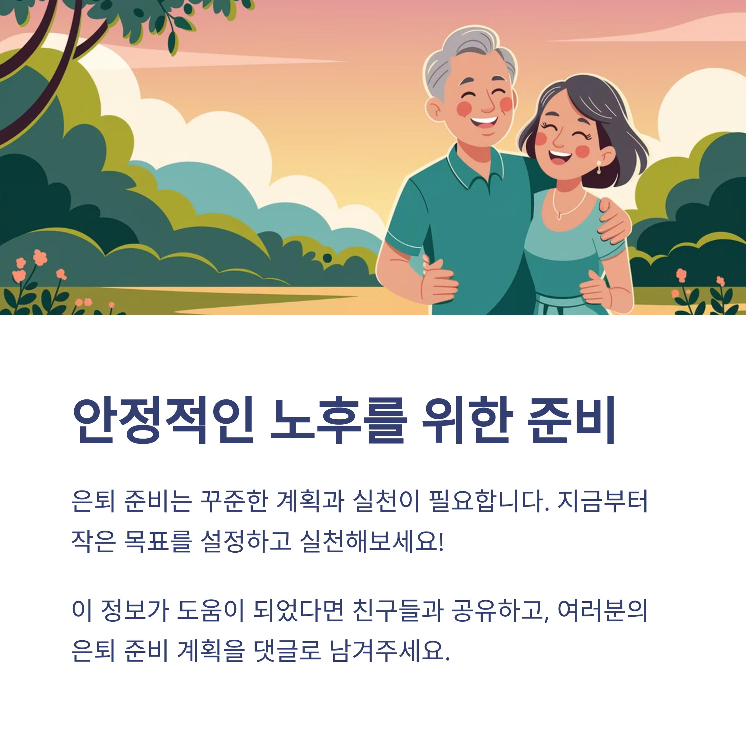 여러분의 은퇴 준비는 어디까지 진행되었나요? 지금 바로 작은 목표부터 설정하고 실천해보세요! 혹시 궁금한 점이 있다면 댓글로 남겨주세요. 함께 더 나은 은퇴 준비를 위한 정보를 나눠보아요. 😊
