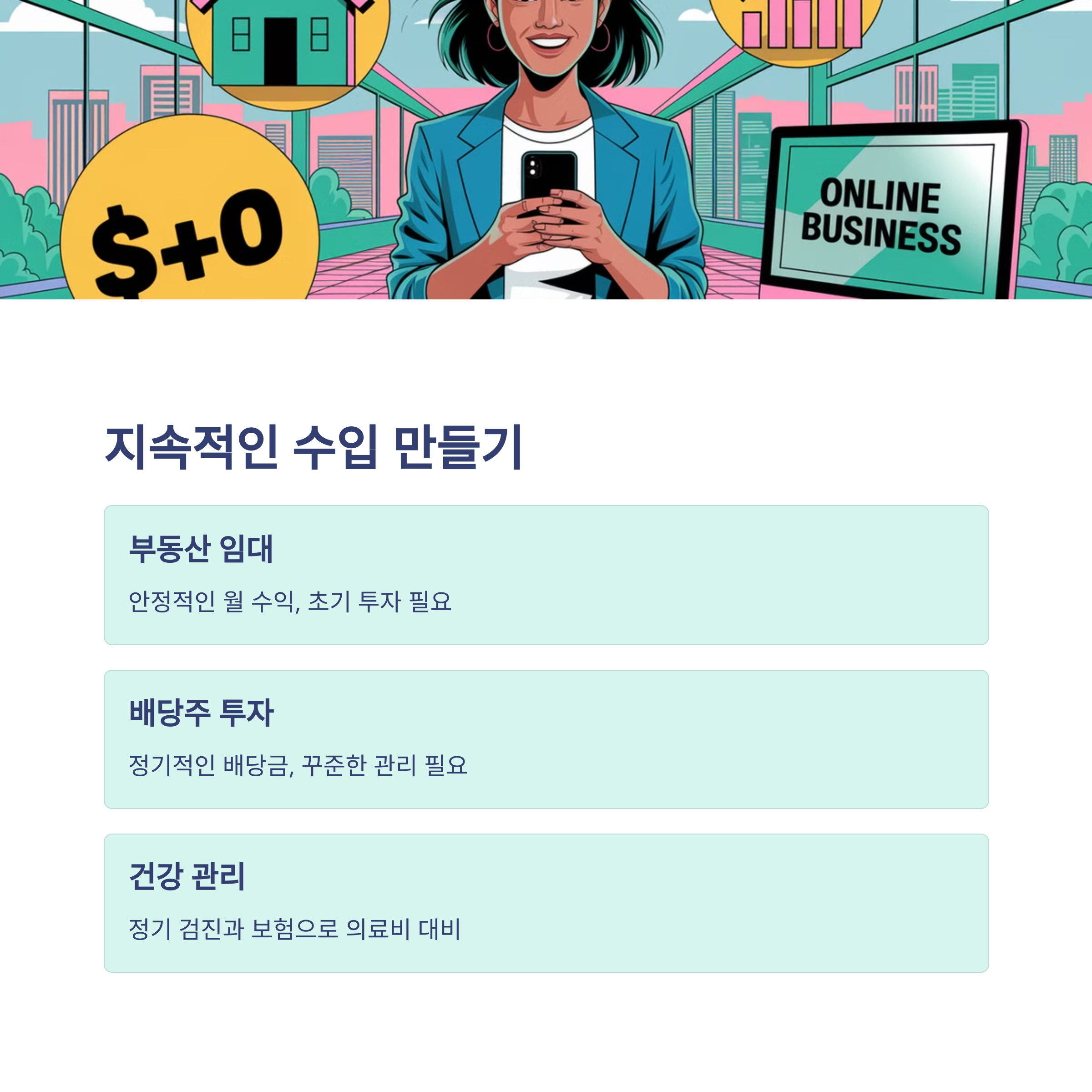 부동산 임대, 배당주 투자, 온라인 강의 제작, 프리랜서 활동 등 다양한 방법이 있습니다. 자신의 전문성을 살릴 수 있는 방법을 찾는 것이 중요합니다.