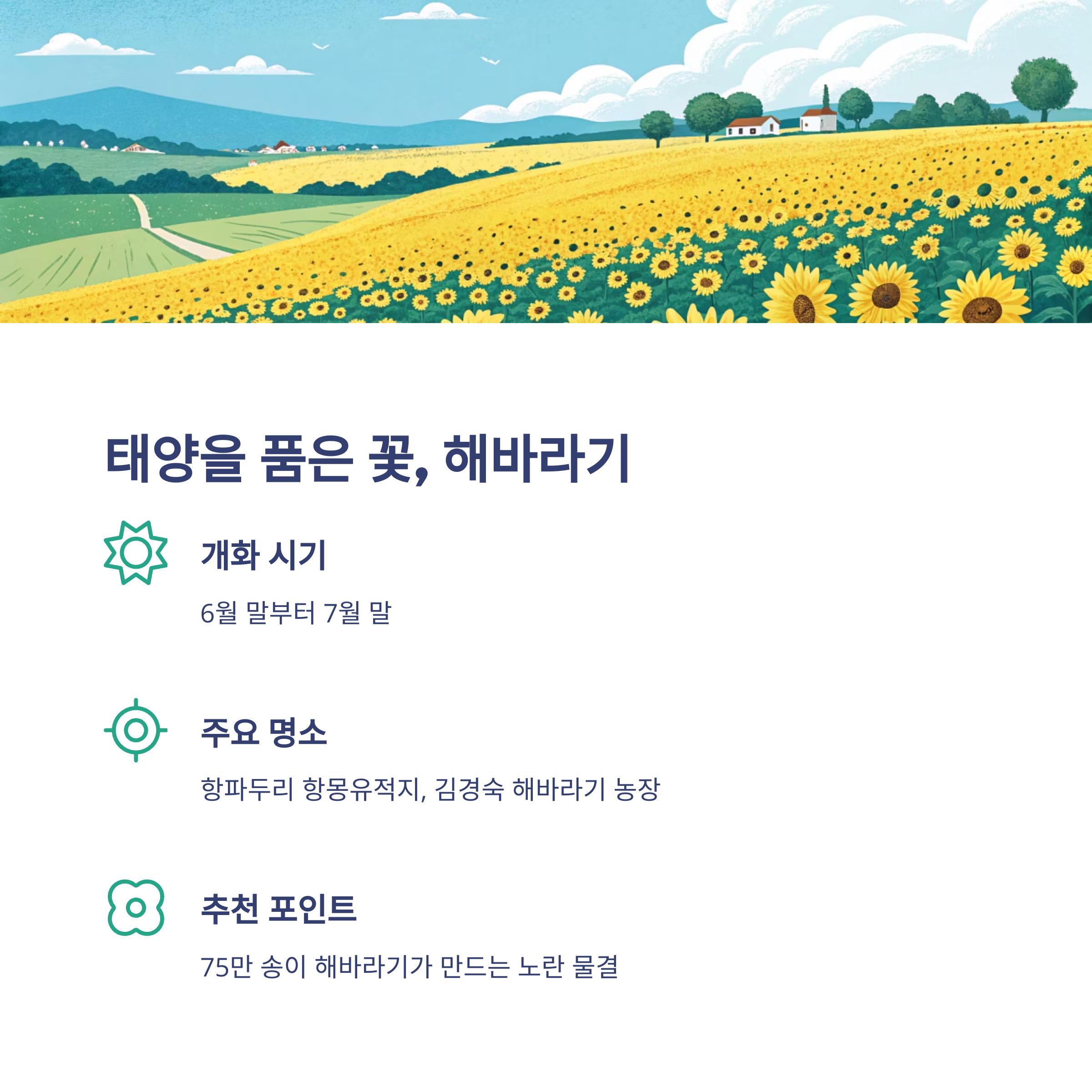 - 김경숙 해바라기 농장: 1만여 평에 달하는 넓은 농지에 75만 송이 해바라기가 장관을 이루는 대표적인 해바라기 명소입니다. 김경숙 해바라기 농장 정보 바로가기