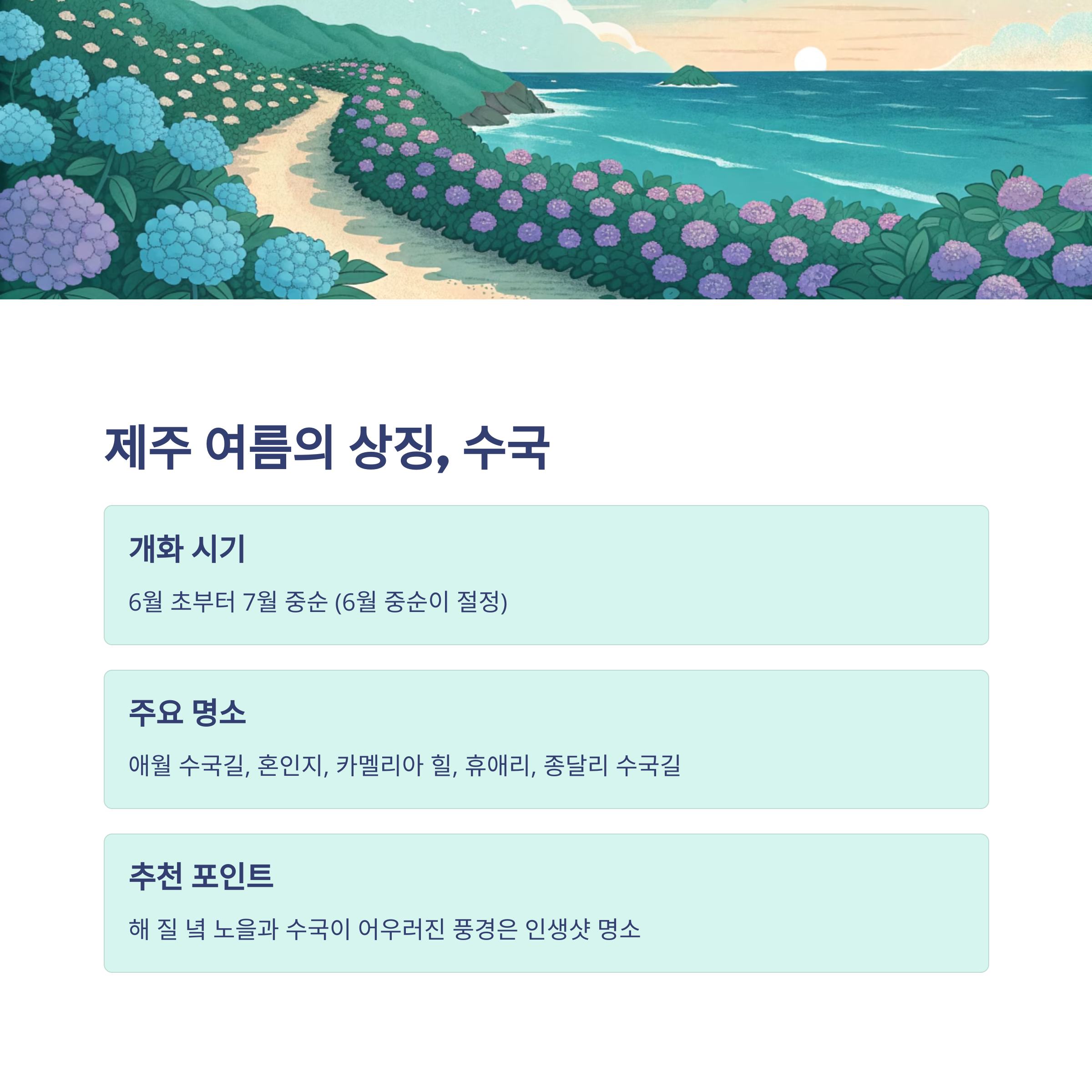 - 애월 수국길: 바다와 어우러진 수국 터널은 제주의 감성을 오롯이 담아냅니다. 특히 해 질 녘 노을과 수국이 어우러진 풍경은 인생샷을 위한 최고의 스팟입니다.