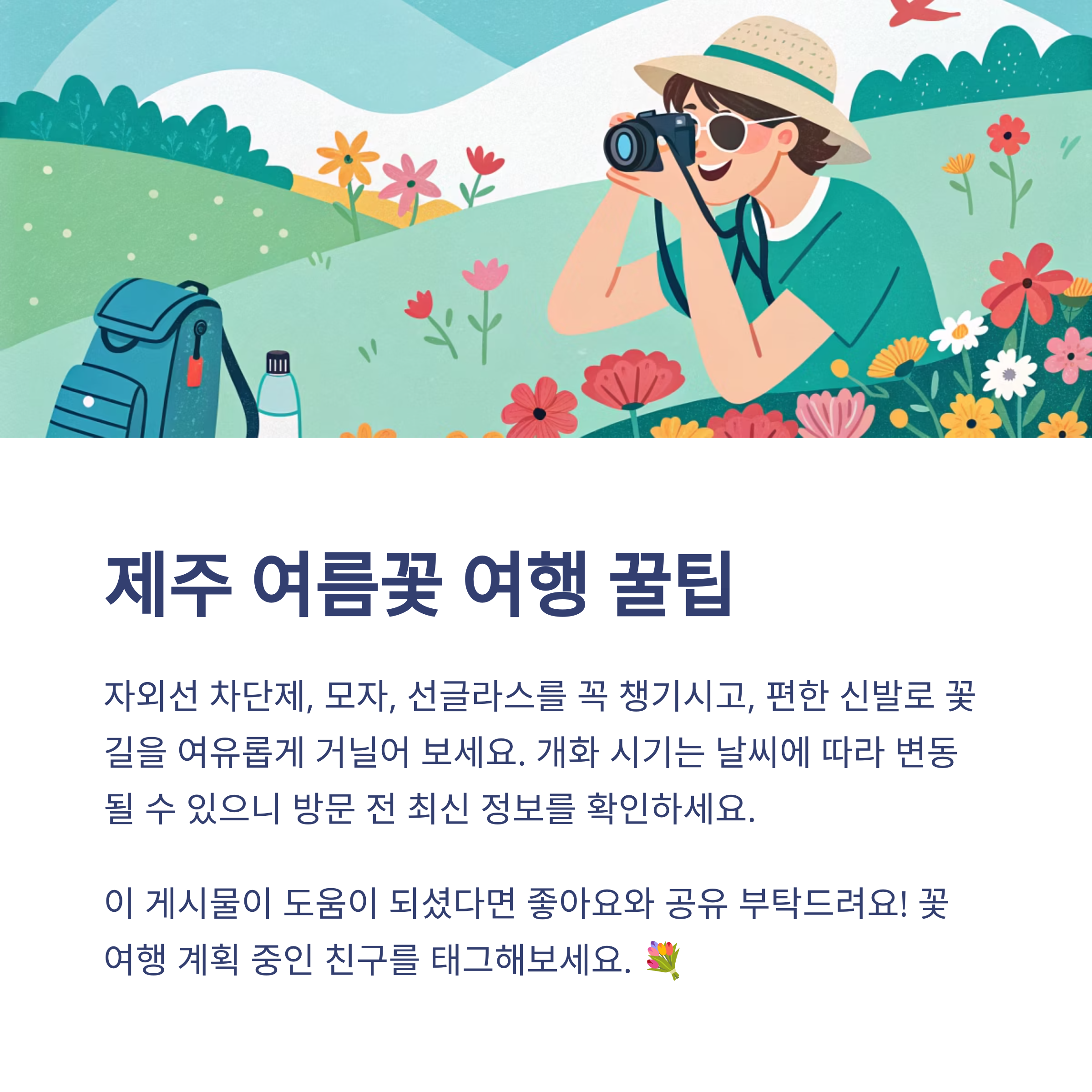 💡 꿀팁: 6월 제주도 여행 시에는 햇살이 강하므로 자외선 차단제, 모자, 선글라스 등을 꼭 챙기시고, 편한 신발을 착용하여 아름다운 꽃길을 여유롭게 거닐어 보세요. 또한, 각 명소의 개화 시기는 날씨에 따라 변동될 수 있으므로 방문 전 해당 명소의 공식 홈페이지나 SNS를 통해 최신 정보를 확인하는 것이 좋습니다.